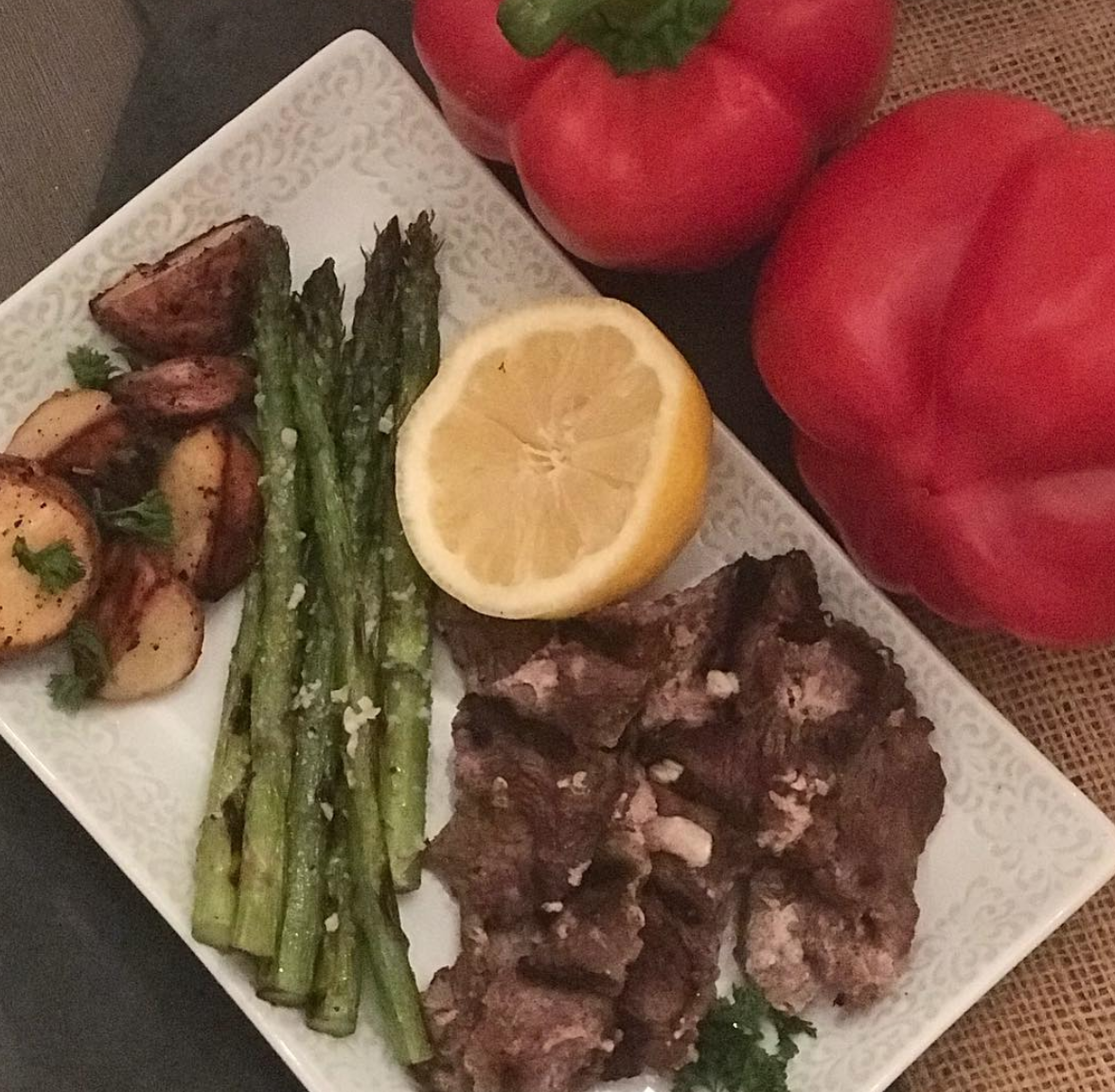 Beef Shawarma with Asparagus and Lemon + Garlic Roasted Potatoes
