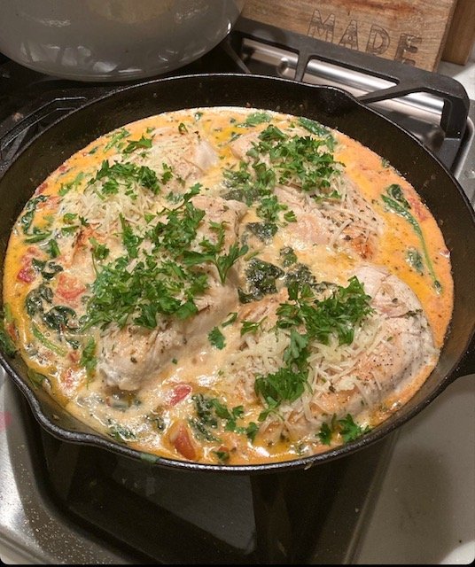 You can choose to slice the chicken breast before returning to skillet (I do this when Iām serving over pasta). If you slice chicken breasts, then just add to skillet and cook until heated through, 3-5 minutes.