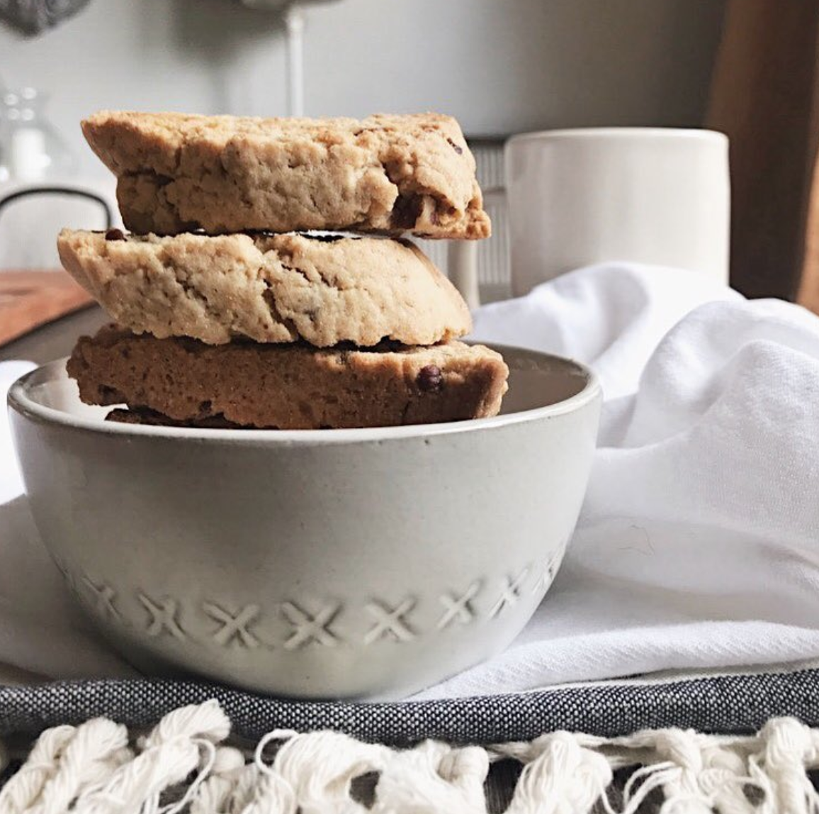 My mom and grammy called this mandel bread, but I always heard mongrel bread which always caused snorts of laughter around the table. Whatever you want to call it, this is a cup of coffee’s and a lazy morning’s best friend. This is a terrific recipe to make with your kids. I still remember shaping the dough and getting flour everywhere! There are many versions of this recipe, but here is the one I grew up with (we didn’t add chocolate chips but an easy add if desired).
