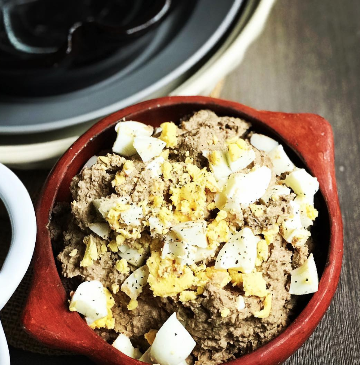 - Check seasonings and adjust as needed. If a bit dry, add remaining chicken fat, 1 T at a time. Pulse until rough pate texture. Scoop into bowl and stir in chopped eggs.