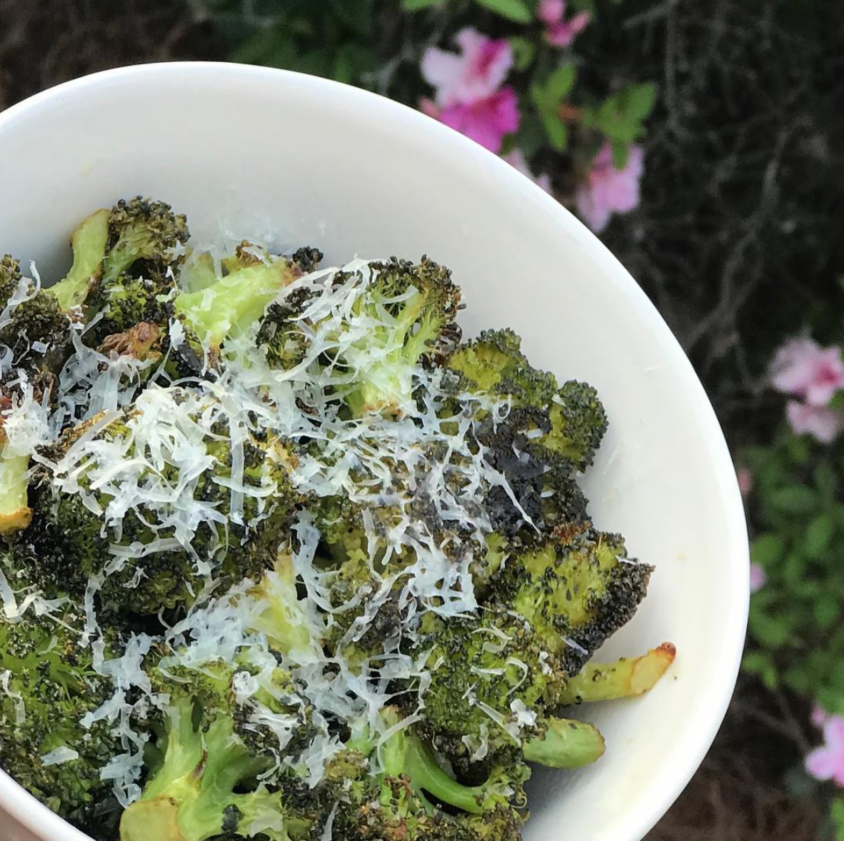 Preheat the oven to 400. I tossed the broccoli in 2 tbsp of Simply Infused Olive Oil herbes de Provence olive oil, Himalayan salt and pepper. Roast in oven for 20 minutes. I finished mine with freshly grated parm and a drizzle of their lavender balsamic.