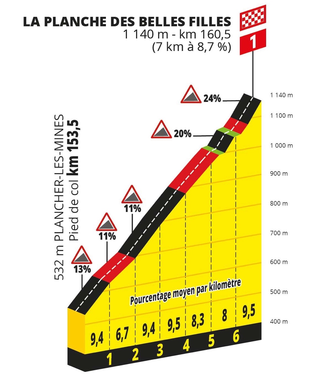 This iconic Category 1 climb and summit finish has always been brutal, but this year with its “discovered” extra kilometer it might be cruel (don’t forget we have weeks of racing and the Alps and Pyrenees ahead). With its average 8.7% gradient, the base soars to a soul crushing 14% gradient. In its previous years, the finishing straight crept up to 20% gradient, but this year the riders have to tackle the “Superplanche.” This extra 900 meters includes a gravel track (well packed), but it is the last 150 meters that may finally produce the attacks the organizers hope for. With 6 categorized climbs behind them, and just about 7 km of leg searing ascent thus far.....La Planche des Belles Filles finishes with a gradient that reaches 22-24%.