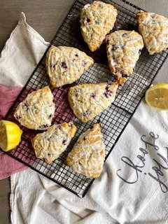 As they cool, whisk together confectioner’s sugar and lemon juice. Add a touch of cream if too thick to drizzle. Drizzle glaze on scones.