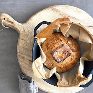Lightly dust a clean work surface with flour, and remove dough from proofing bowl. Pre-shape the dough, by simple folds. Fold 1: pull bottom edge towards you and fold over 1/4-1/2 of the way. Fold 2: Pull top half away, and fold over to slightly overlap bottom flap. Folds 3 & 4: Stretch dough from both sides and fold each side towards center to slightly overlap (think envelope when you are stretching and folding). Flip the little package to folded side down onto a large piece of parchment paper. Cover with kitchen towel and allow pre-shaped loaf to bench rest, approximately 40 minutes.