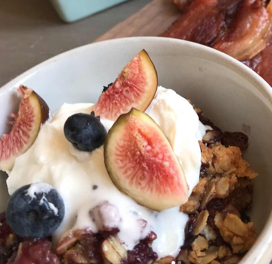 On this Sunday Brunch menu: Fig Blueberry Crumble with Goat Cheese Whipped Cream (@stonehollowfarmstead), scrambled eggs and thick-cut smoked bacon from  @marblecreekfarmstead.
