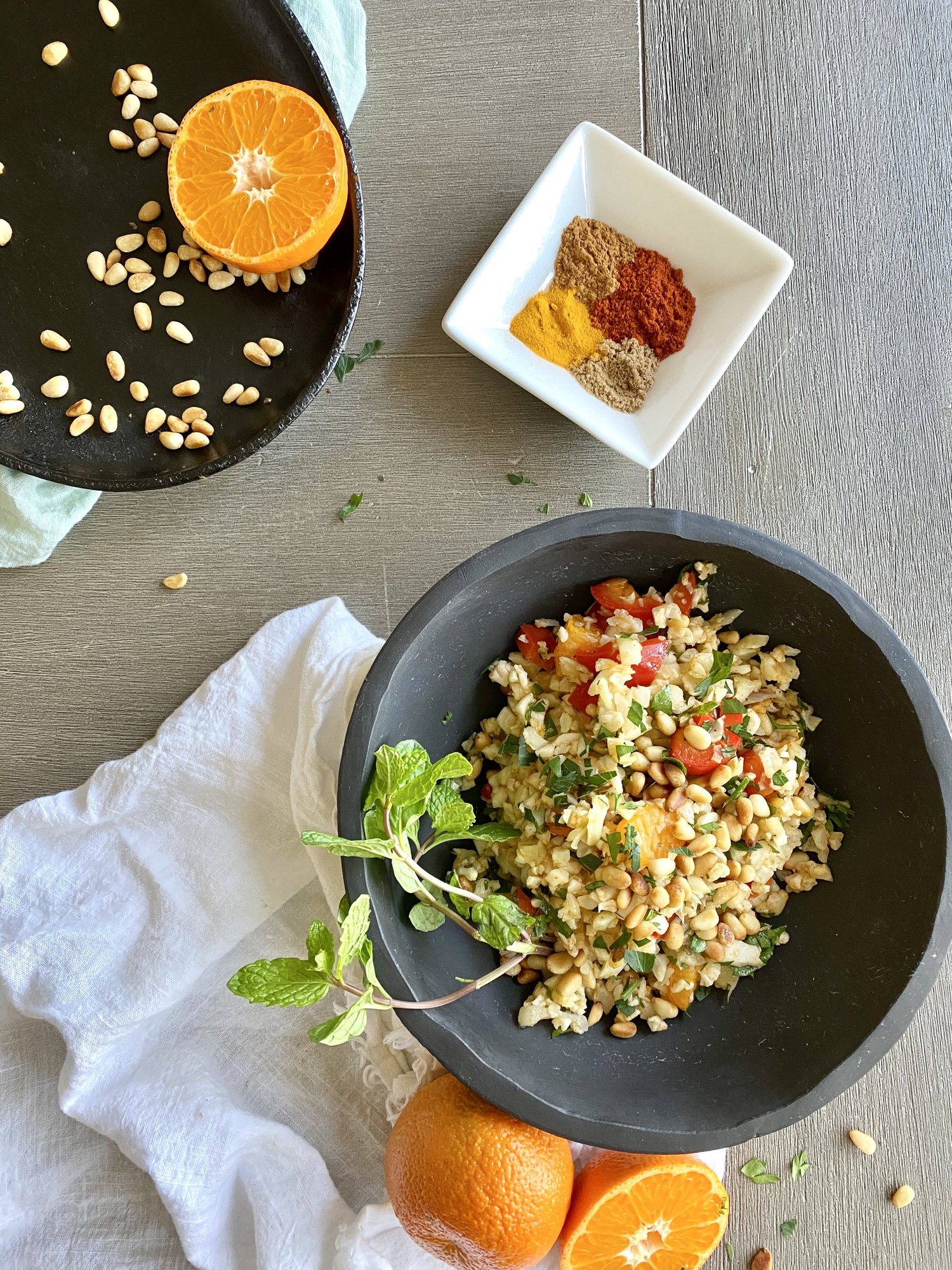 Vibrantly flavored with warm spices, bright citrus, the sweetness of honey, and crisp mint. This dish of course can be made with cous cous, but I had two bags of cauliflower rice so used that instead! This is absolutely wonderful served as a side warm, leftover as a cold salad, or add a protein and make it the star of your meal.