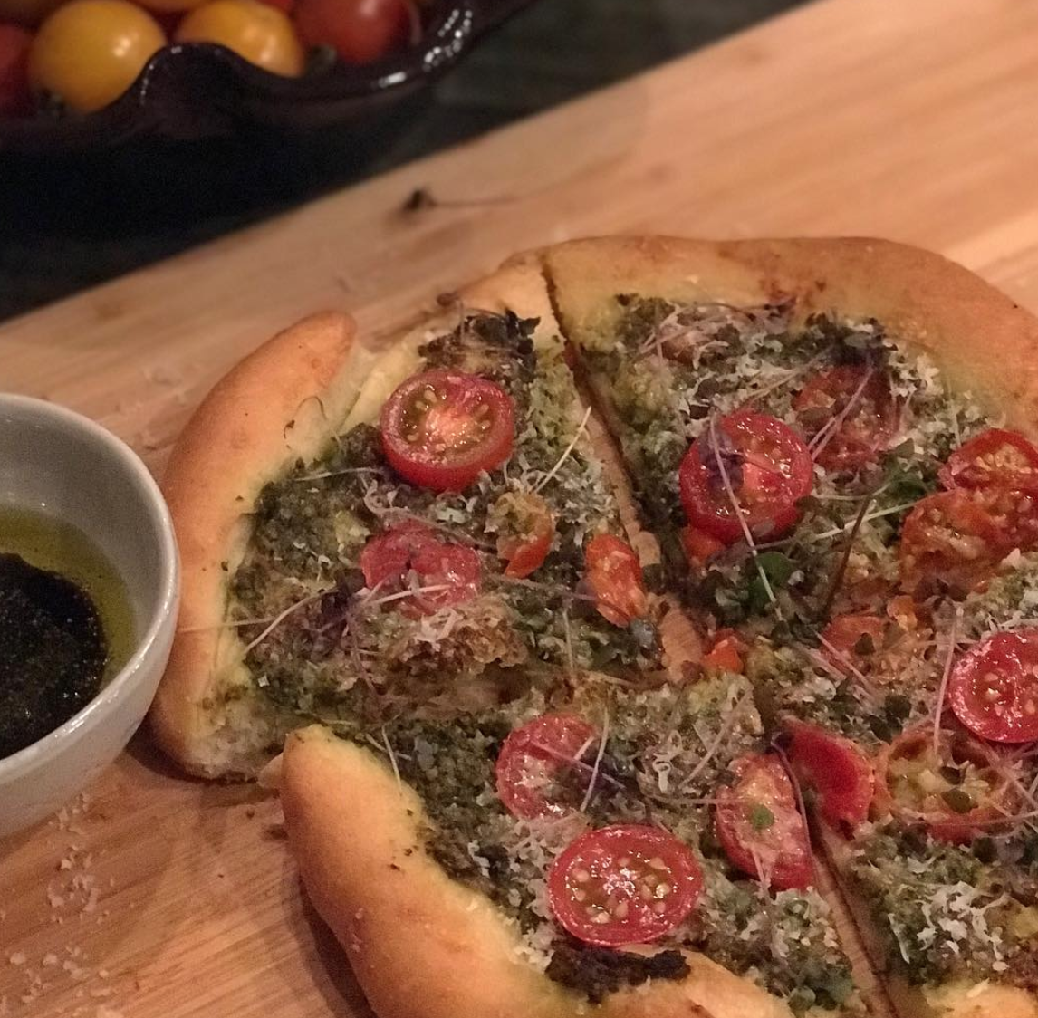 When it comes to bread, I go to James Beard and my trusty, oil stained and flour dusted copy of his Complete Book of Breads. This pizza dough is like a 101 in bread making. It’s forgiving, fun and fast.