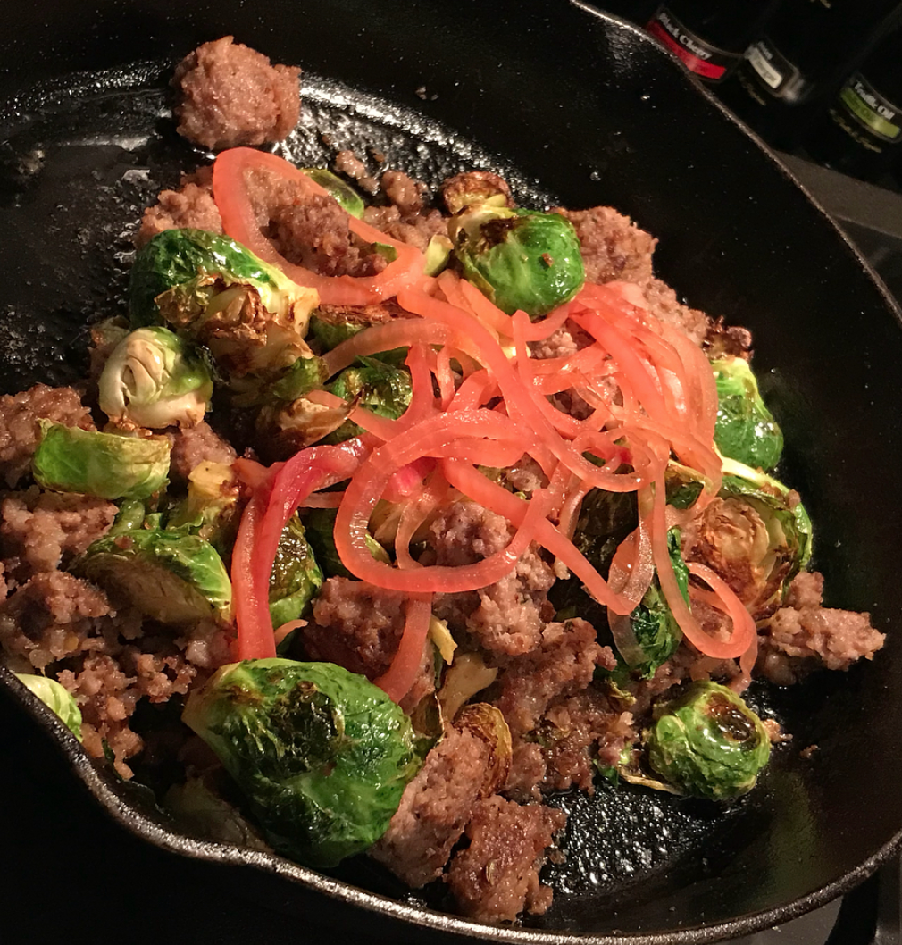 - While it bakes, sauté sausage, set aside, and add Brussels sprouts to sausage drippings. Cook until caramelized. Add sausage back to skillet. Season to taste.